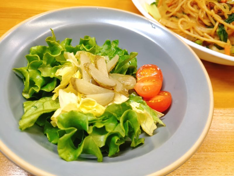 サラダは、レタス・サニーレタス・ミニトマト・ピクルス。