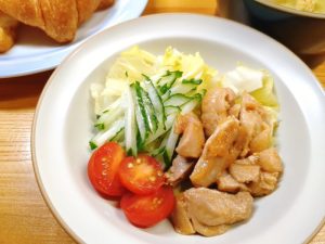 サラダは、レタス・きゅうり・ミニトマト・梅酒の照り焼き鶏。