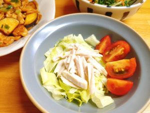 サラダは、レタス・ミニトマト・セロリ・サラダチキン。