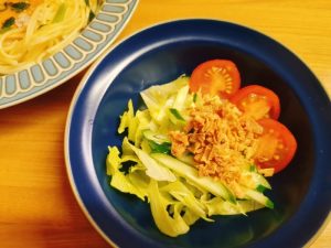 サラダは、レタス・きゅうり・ミニトマト・フライドオニオン。