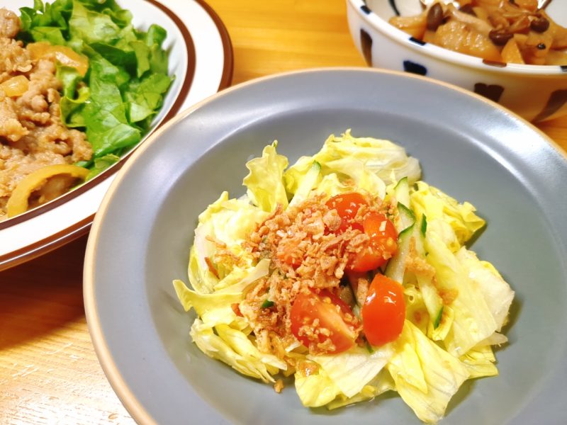 サラダは、レタス・きゅうり・ミニトマト・フライドオニオン。