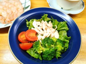 サラダは、サニーレタス・ミニトマト・ブロッコリー・蒸し鶏。