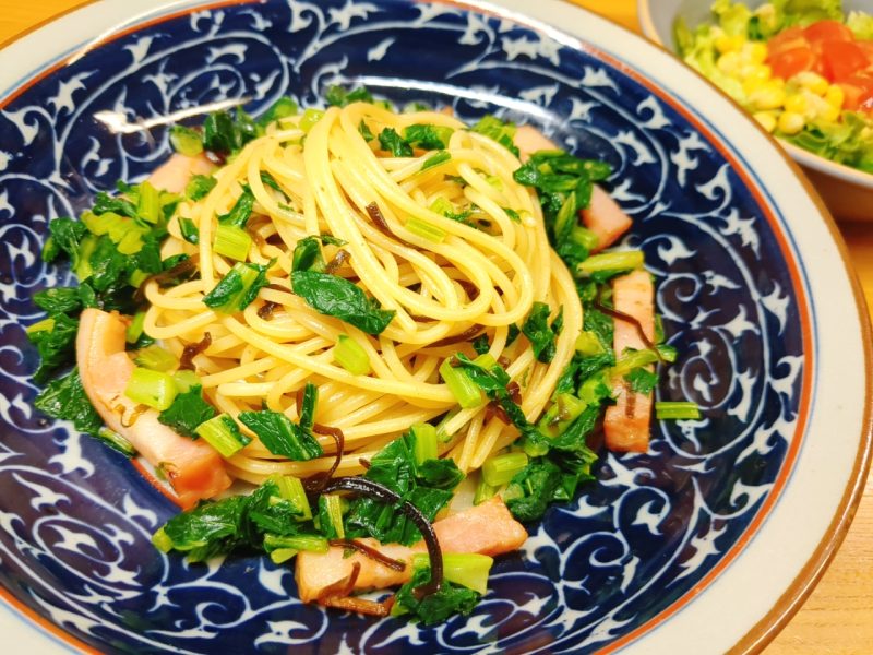 大根の葉とベーコンの和風パスタ、
