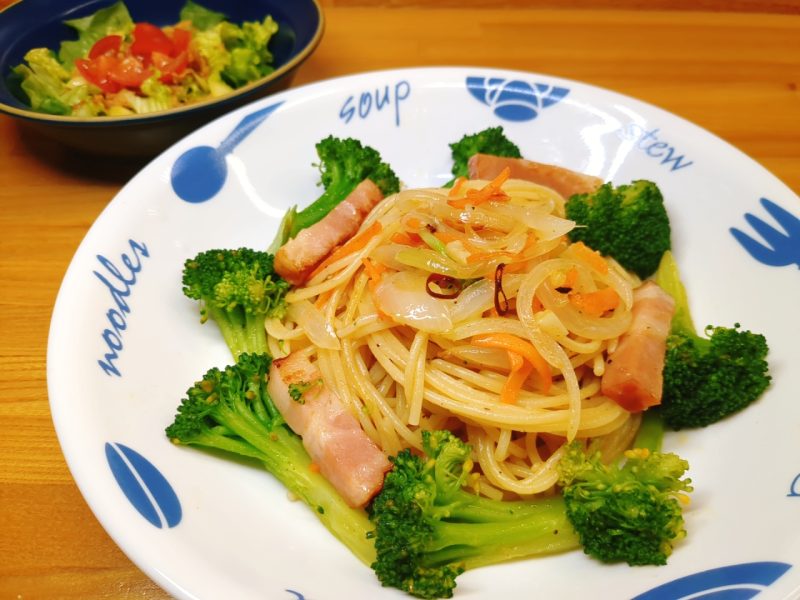 ニンニク・赤唐辛子を炒めてから、ベーコン・玉ねぎ・人参とブロッコリーをたくさん。