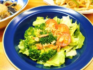 サラダは、レタス・ミニトマト・ブロッコリー・フライドオニオン。