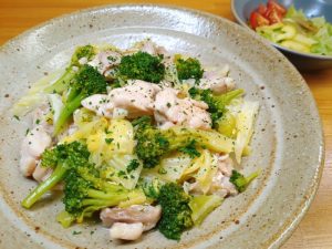 レシピは鶏もも肉とキャベツですが、キャベツを減らしてブロッコリーを入れました。