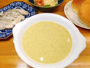 今日の晩ごはんは『さつまいもとグリンピースのポタージュ』です。