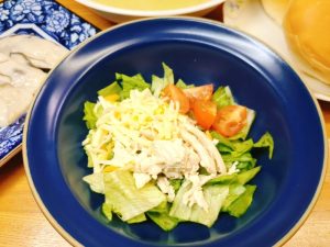 サラダは、レタス・ミニトマト・蒸し鶏、ミックスチーズ。