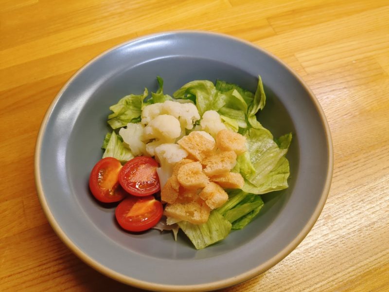 サラダは、レタス・ミニトマト・カリフラワー・味付ききざみ揚げ。