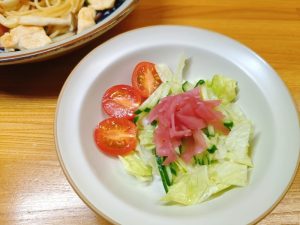 サラダは、レタス・ミニトマト・きゅうり・紅大根の甘酢漬け。