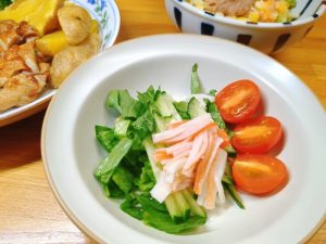 サラダは、レタス・きゅうり・ミニトマト・カニカマ。