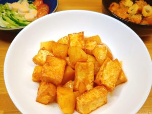 じゃがいもと厚揚げのコチュマヨ炒め、