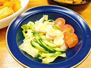 サラダは、レタス・きゅうり・ミニトマト・チーズかまぼこ。