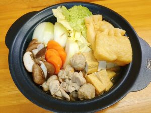 写真は、鶏肉とすり身団子だけ先に加熱をして、野菜や厚揚げなどを入れたところです。