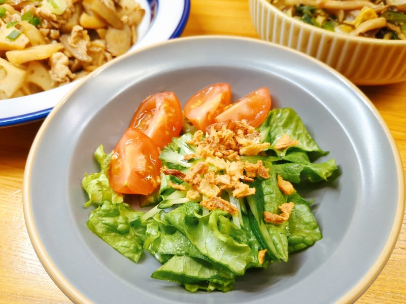 サラダは、リーフレタス・きゅうり・ミニトマト・フライドオニオン。