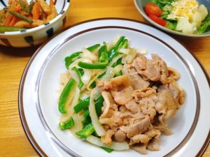 玉ねぎとピーマンも炒めて一緒に頂きました。