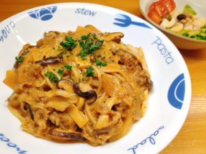 今日のパスタは『牛肉ときのこの煮込みソースパスタ』です。