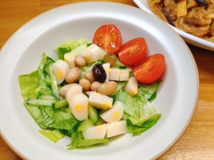 サラダは、レタス・きゅうり・ミニトマト・チーかま・ミックスビーンズ。
