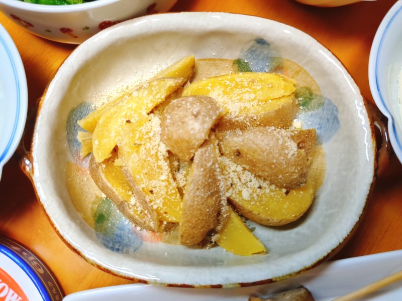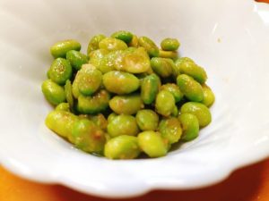 むき枝豆は、炒めてガーリックパウダーと醤油で味付け。