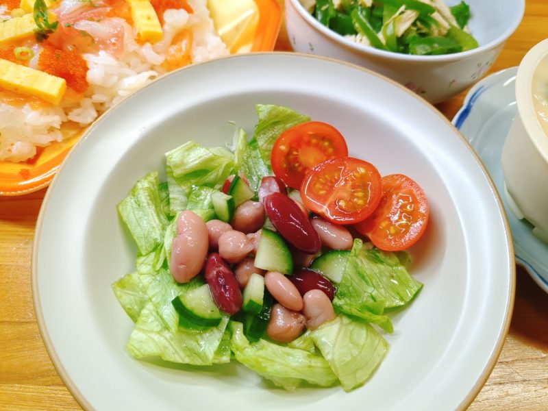 サラダは、レタス・きゅうり・ミックスビーンズ・ミニトマト。