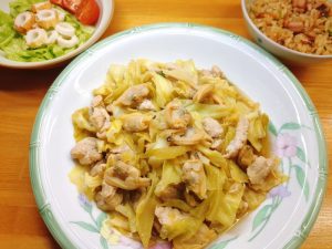 キャベツと豚肉を軽く炒めてから、あさりのむき身は冷凍を使っているのでそのままフライパンに入れて、ポン酢とお酒をかけて蓋をして蒸しました。
