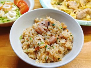 ご飯は、生協に注文をした冷凍食品の「いかめし」。