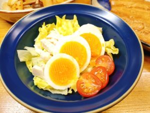 サラダは、レタス・ミニトマト・サラダチキン・ゆで卵。