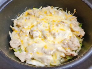 もやし、長ねぎ、豚肉を重ねて塩コショウとお酒をかけて蒸して、豚肉に火が通ってから最後にミックスチーズをのせて蒸すというものです。