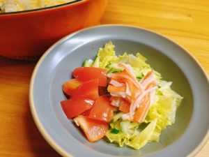 サラダは、レタス・きゅうり・トマト・カニカマ。