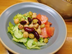 サラダは、レタス・きゅうり・トマト・ミックスビーンズ。