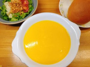 今日の晩ごはんは『かぼちゃと人参のポタージュ』です。