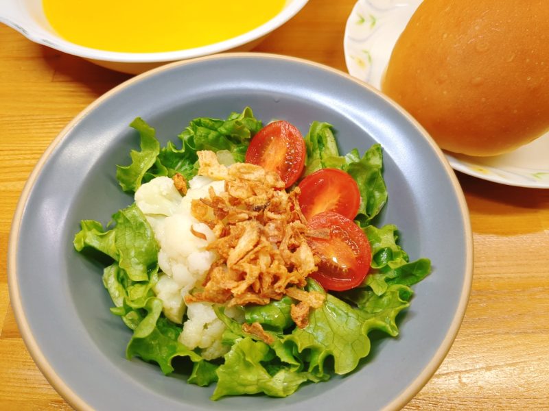 サラダは、サニーレタス・カリフラワー・ミニトマト・フライドオニオン。