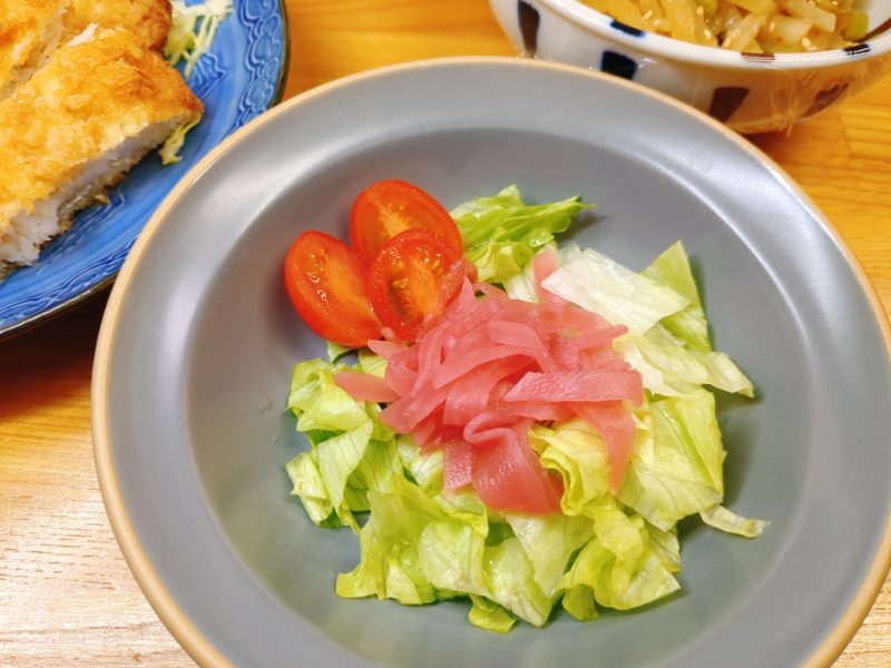 サラダは、レタス・ミニトマト・紅大根の甘酢漬け。