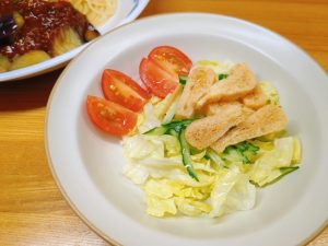 サラダは、レタス・きゅうり・ミニトマト・味付ききざみ揚げ。