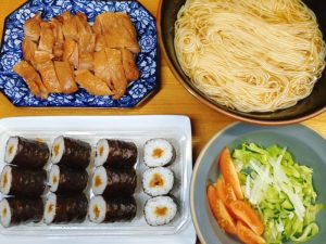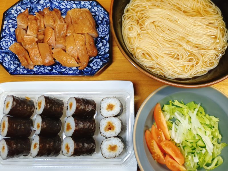 今日の晩ご飯は、スーパーで買った かんぴょう巻とにゅうめん。