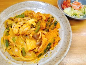 鶏肉・かぼちゃ・玉ねぎ・ベーコンをバターとポン酢で味付けるというもので、これをフライパン蒸しにしました。