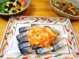 生協の商品で、しめさばと岩下の寿司ガリと人参を和えたもの。