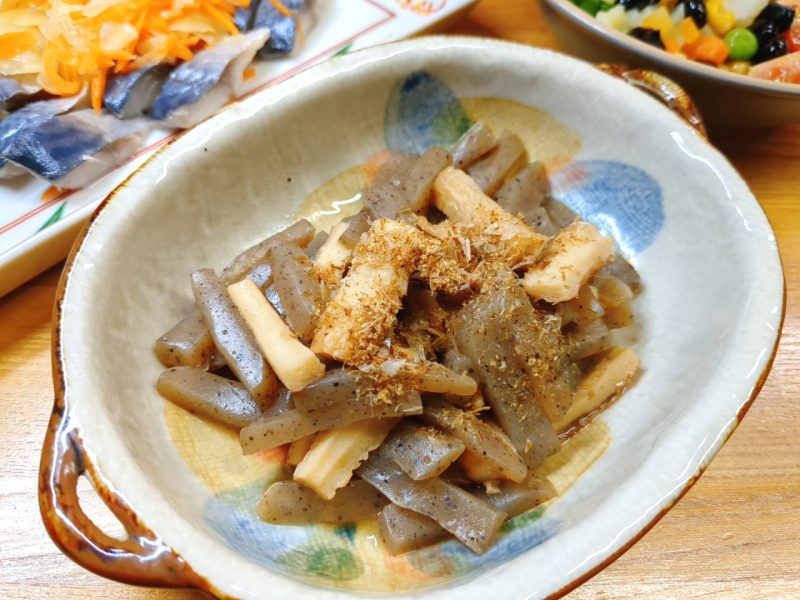 こんにゃく・ちくわを細切りにして炒め、酒・みりん・だしの素・醤油で味付け。