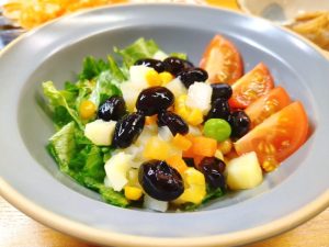 サラダは、レタス・ミニトマト・ミックスベジタブル・じゃがいも・黒豆。