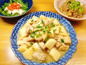 今日の晩ごはんは、『長いも鶏肉の辛味噌さっぱり煮』です。