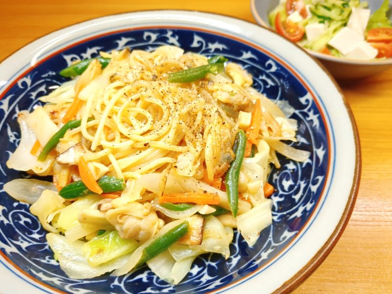 今日のパスタは『あさりとたっぷり野菜の和風パスタ』です。