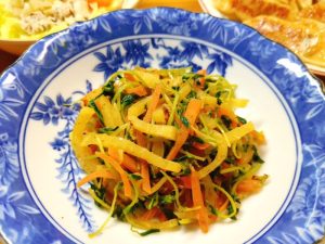 豆苗とたくあんのおかか炒め、
