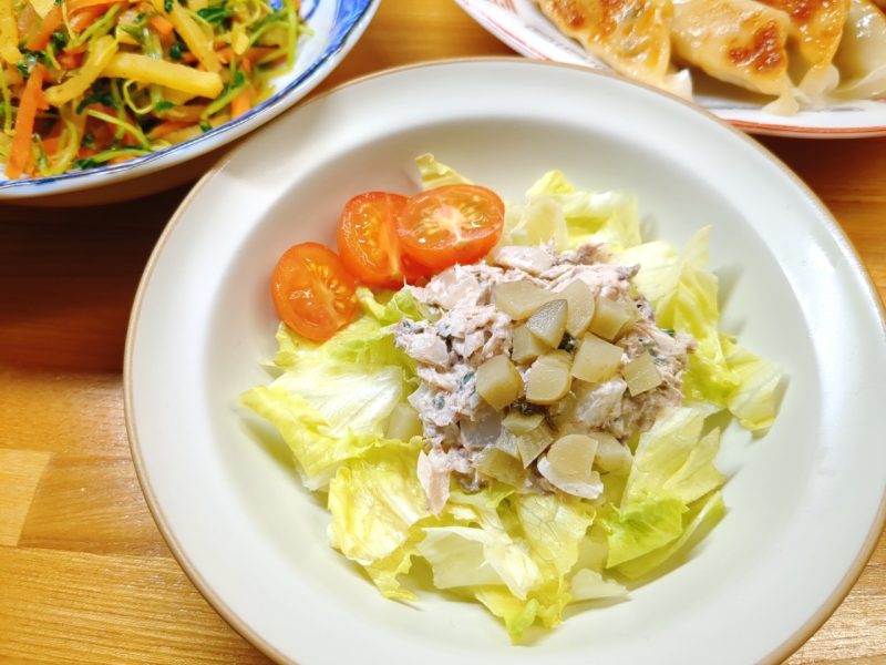 サラダは、レタス・ミニトマト・ピクルス・さば水煮缶と玉ねぎと大葉。