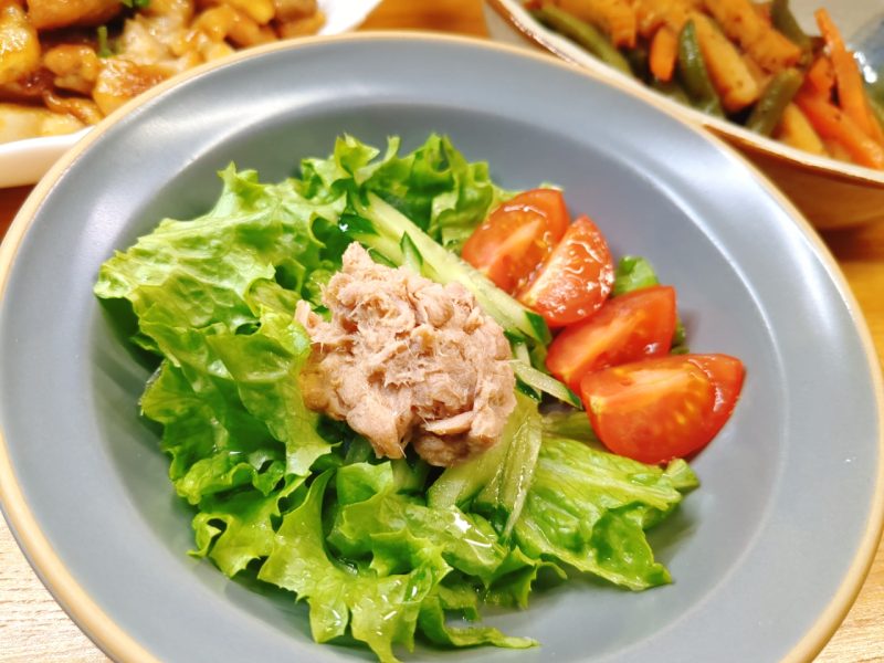 サラダは、リーフレタス・きゅうり・ミニトマト・ツナ。