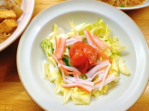 サラダは、レタス・きゅうり・ミニトマト・カニカマ。