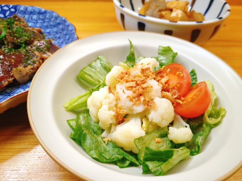 サラダは、レタス・ミニトマト・カリフラワー・フライドオニオン。