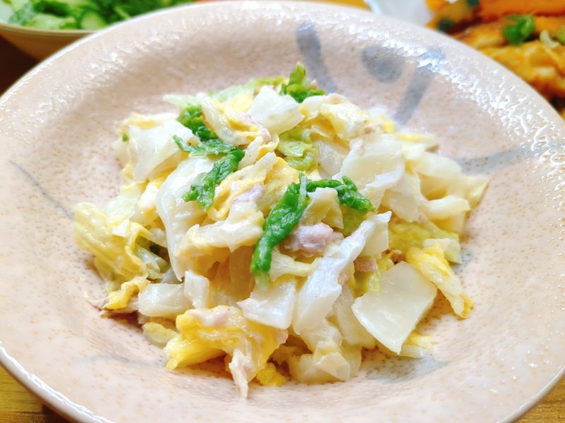 副菜は作り置きの『白菜とツナのみそマヨあえ』。