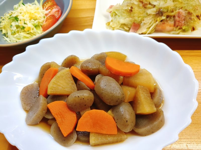 こんにゃくだけを食べるより、大根や人参を加えて煮物にしてみようということになり、作ってみました。